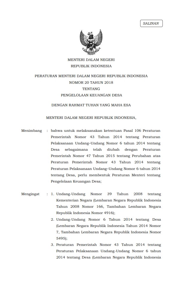 - Permendagri N0 20 tahun 2018 tentang Pengelolaan Keuangan Desa